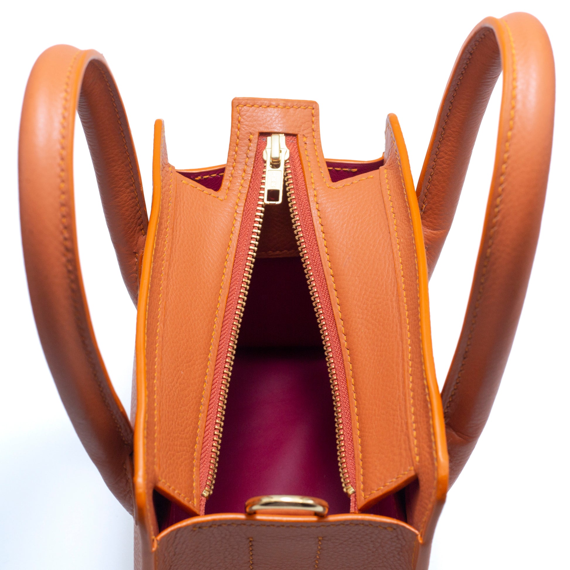 Featuring two internal pockets, a top zip closure. Made using premium calfskin with a grain pattern and is lined with chèvre (goatskin). This bag is hand sewn using age old European techniques and the finest materials.
